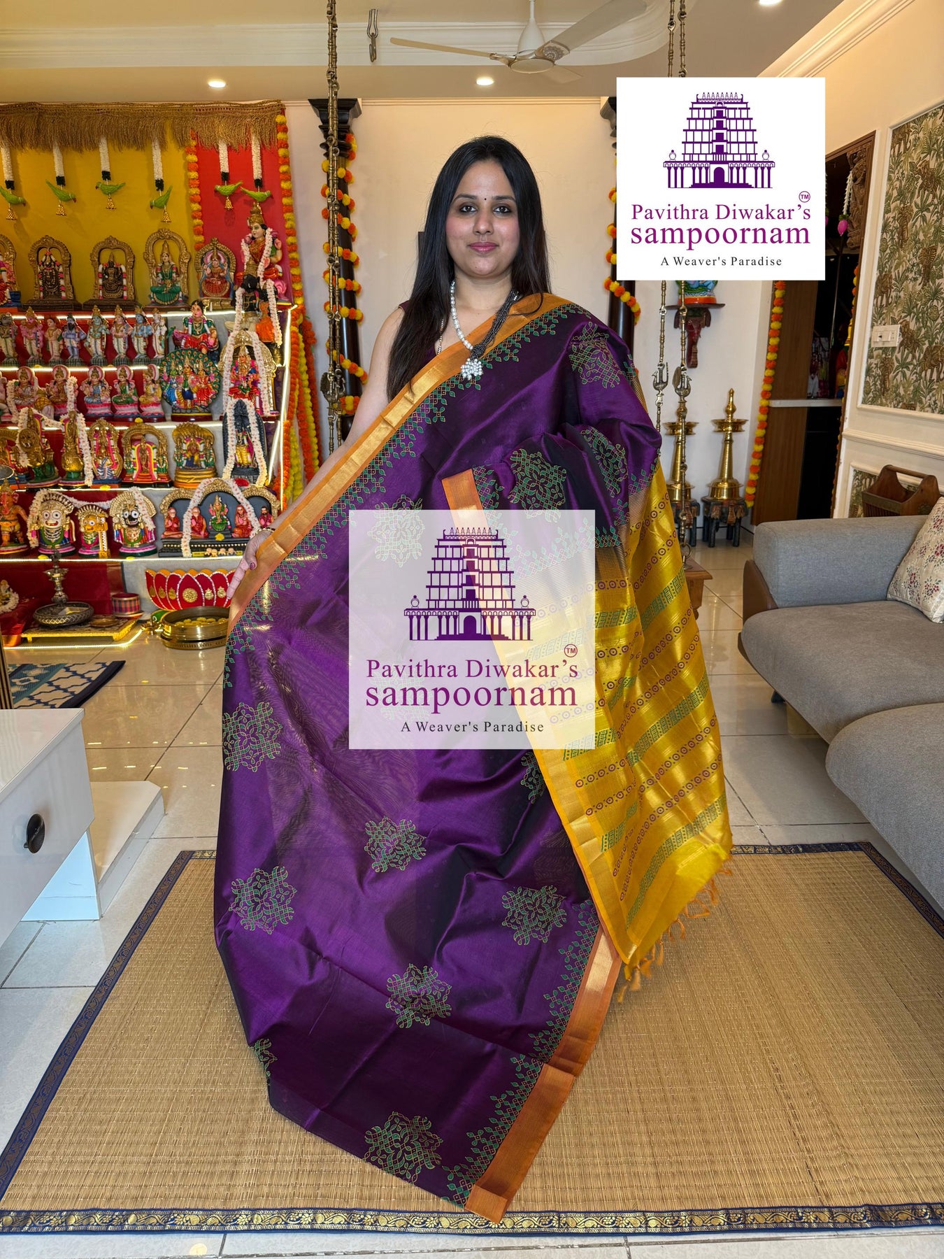 Purple with Fenugreek , traditional borders and rich Pallu Kolam Handblock Printed Silkcotton Saree