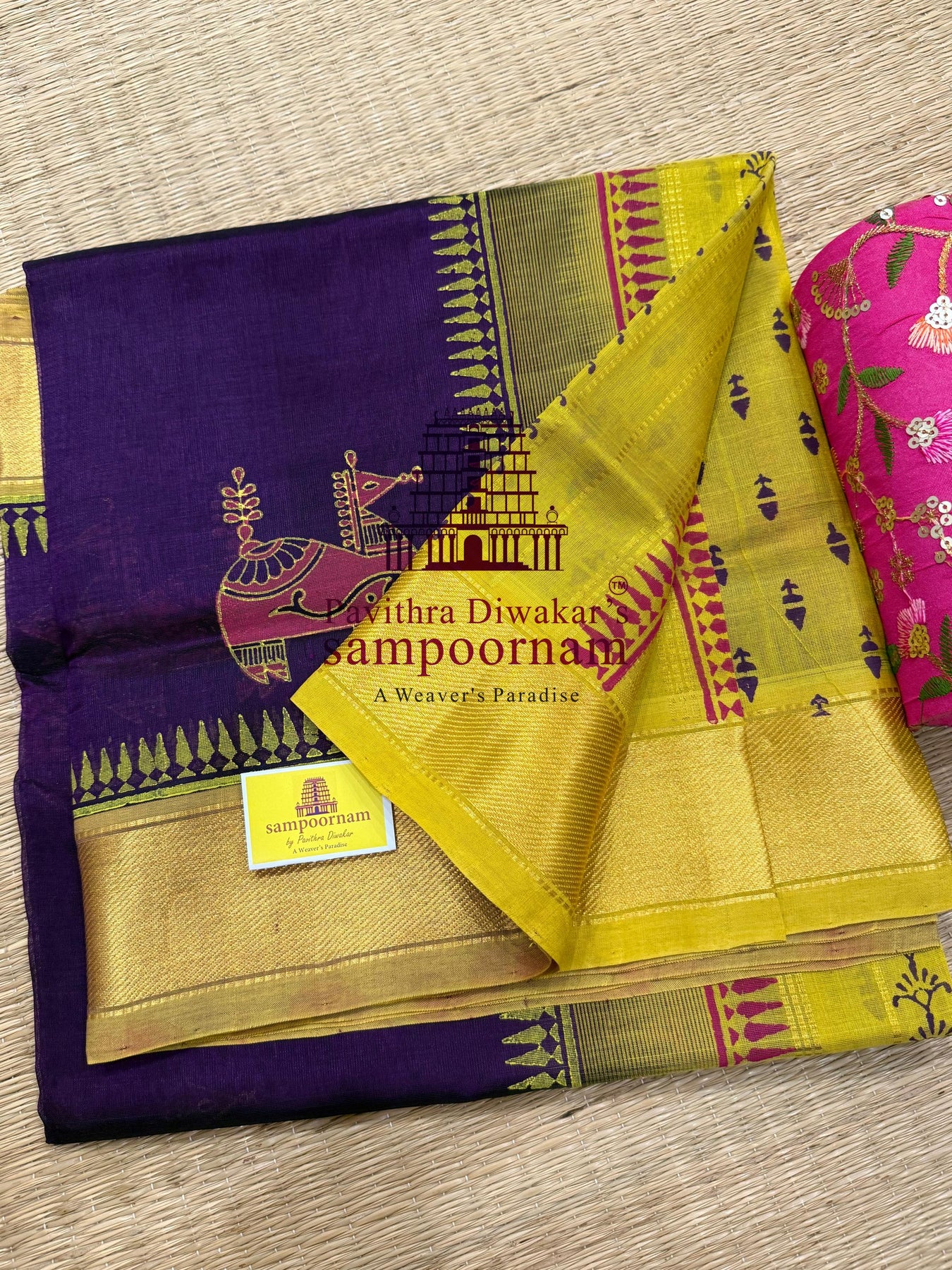 Purple with Lemon Yellow , traditional borders and rich Pallu , Terracota horse printed Silk Cotton Saree