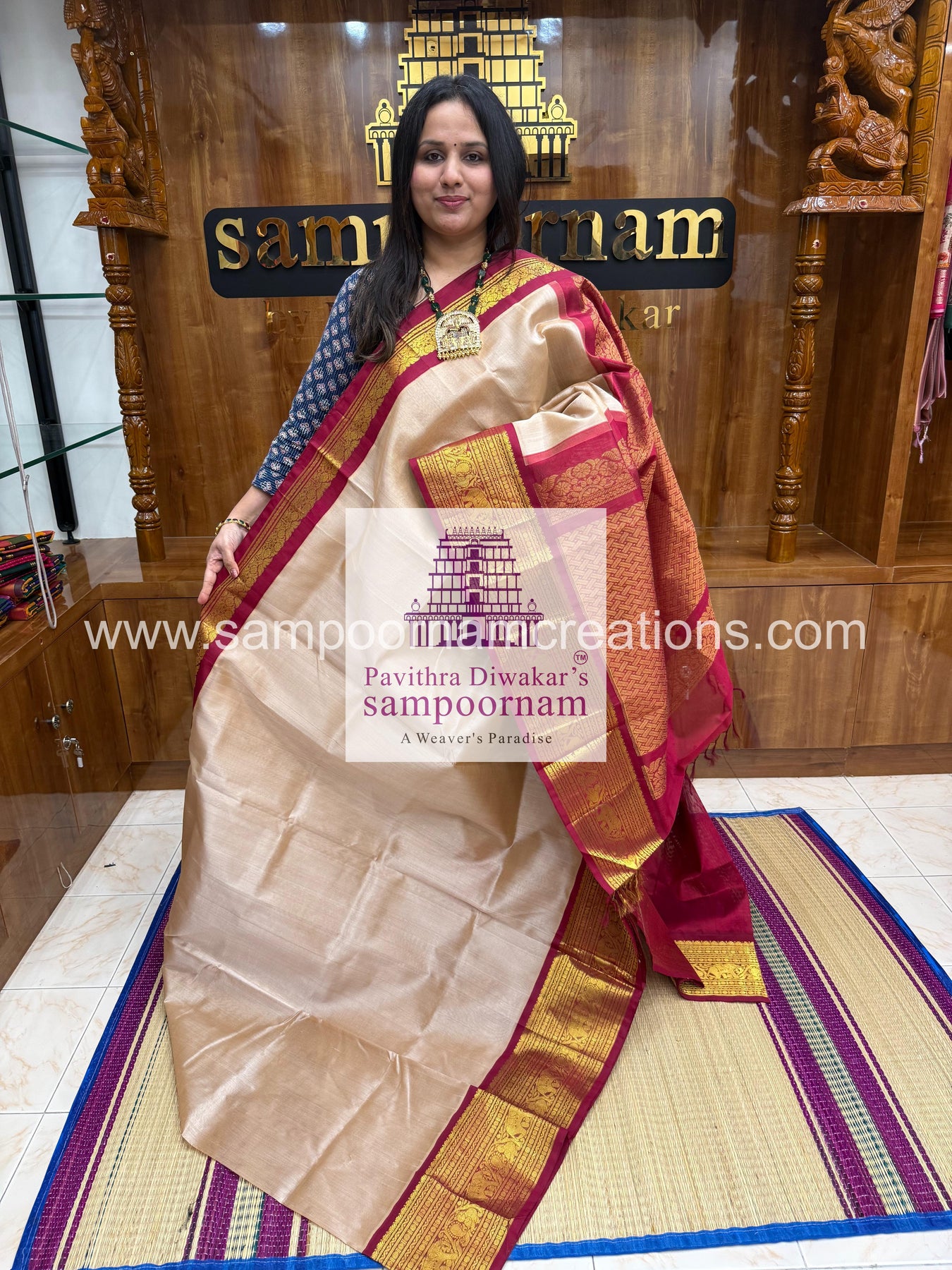 Beige with Dark Red , rich Kanchi one side big border with grand Pallu Korvai Silk Cotton Saree