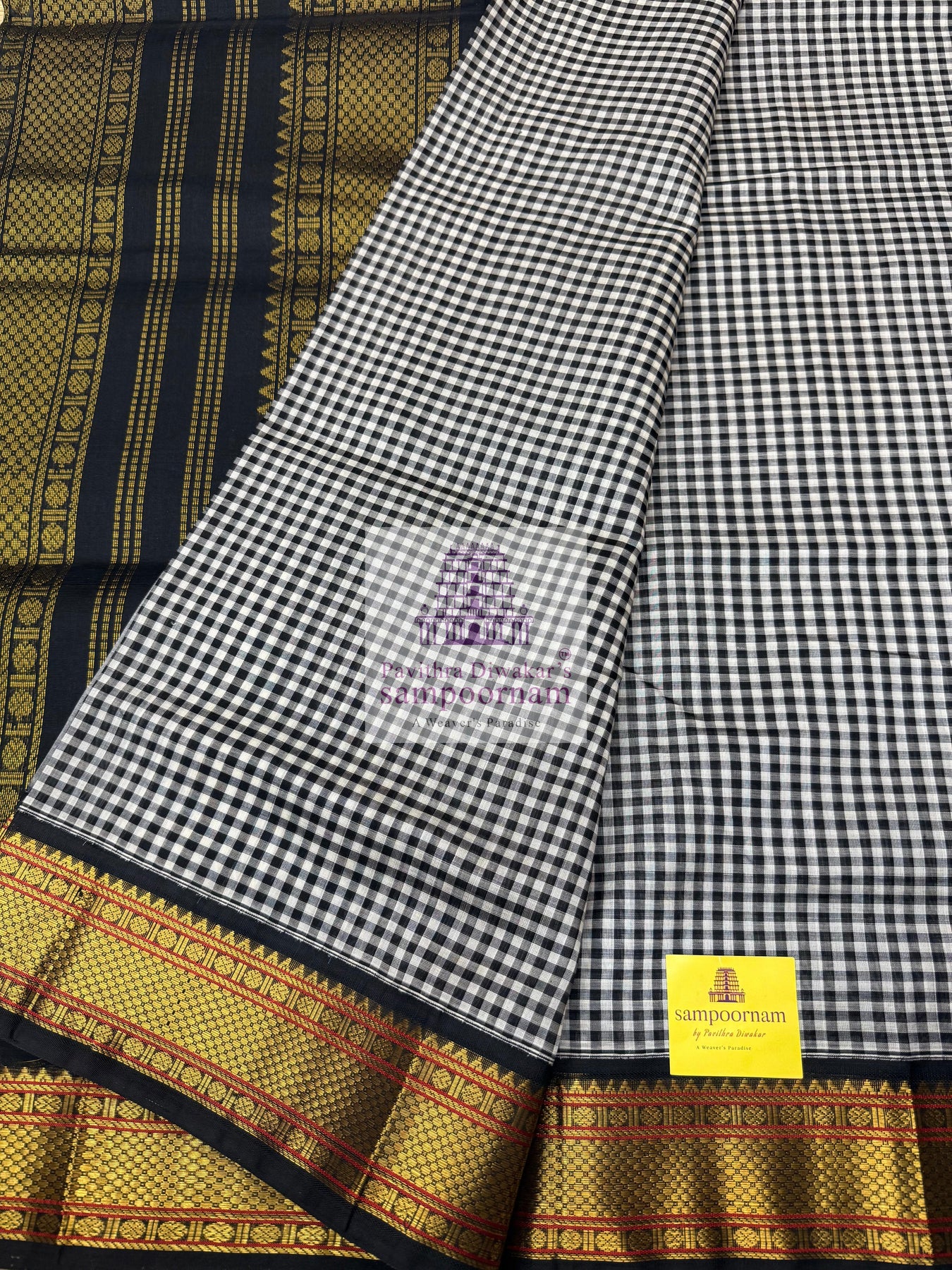 Black white Podi Kattam with Traditional Borders and Rich Pallu Korvai Silk Cotton Saree