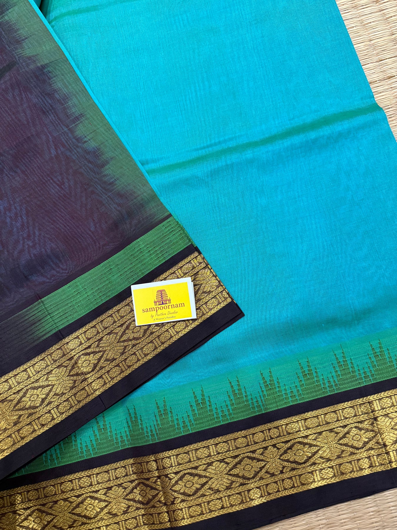 Blue with Brown Temple traditional borders and Rich pallu korvai silk cotton saree