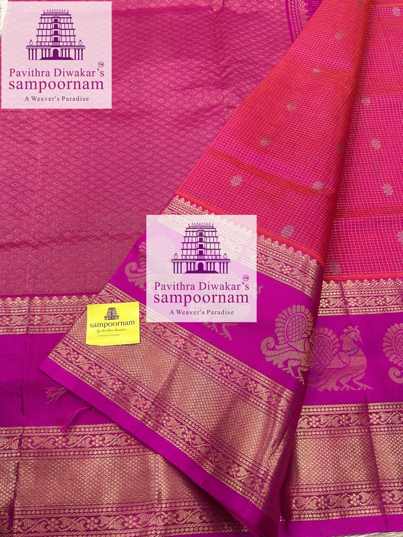Dark Pink with Pink Zari Podi Kattam in the body , one side big Satin border with Annam motif , traditional border and rich Pallu Korvai Silk Cotton Saree