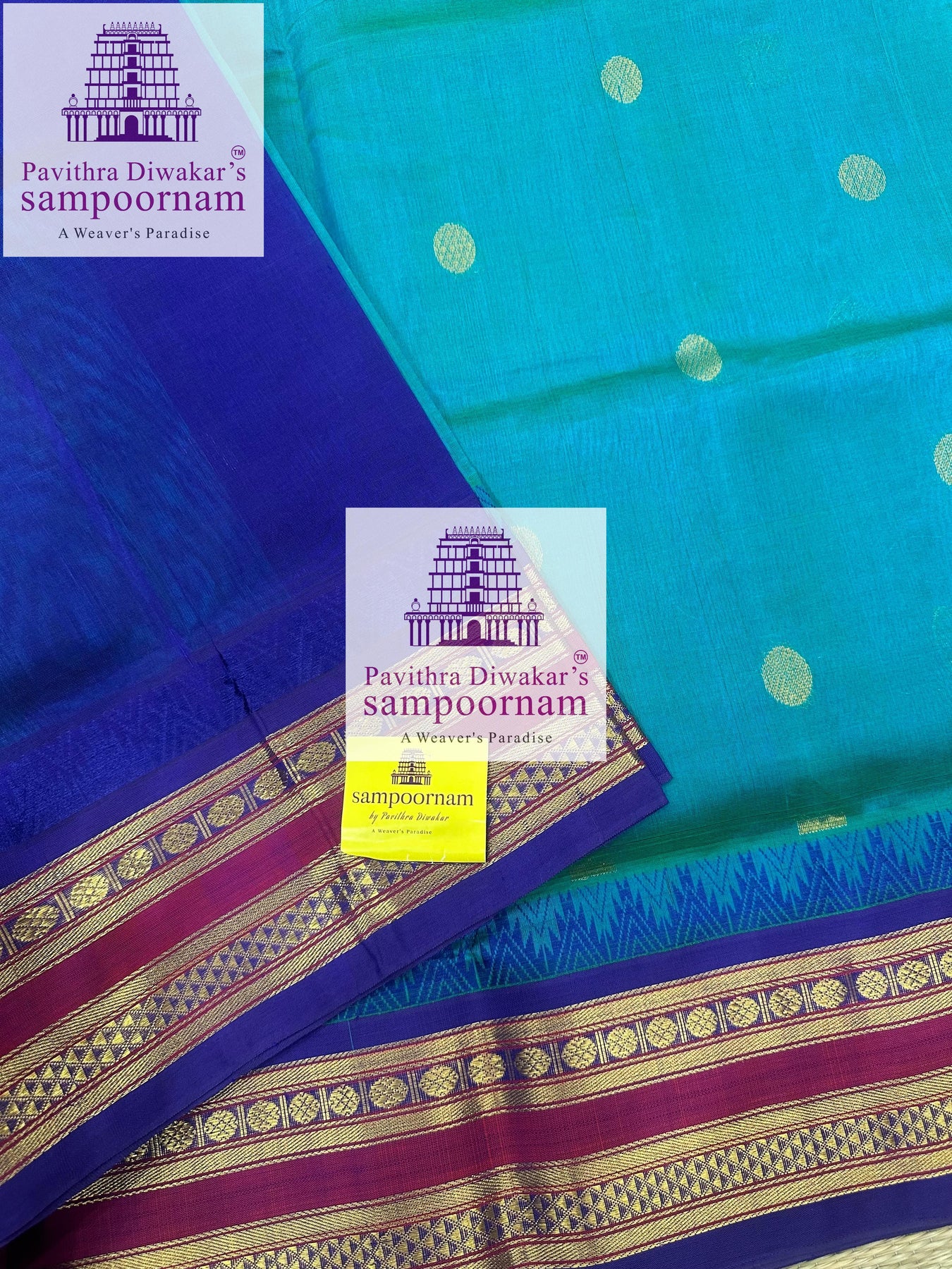 Ramar Blue with Dark Blue ,rich Zari butta in the body, traditional borders and rich , rich Zari butta in the body and Kanchi traditional borders and rich Pallu Korvai Silk Cotton Saree