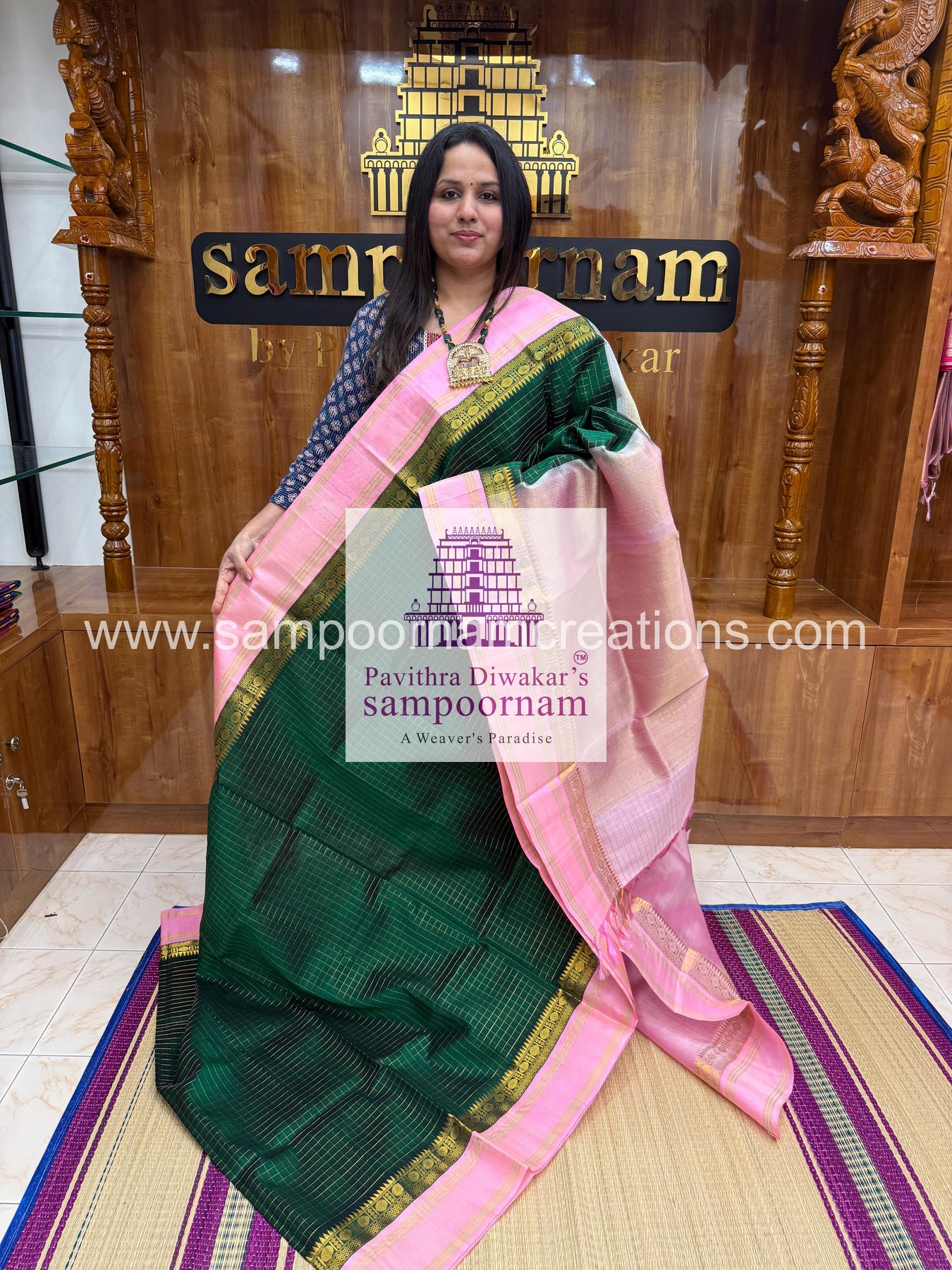 Green with Baby Pink , Zari checks in the body , rettapet border and grand Pallu Korvai Silk Cotton Saree