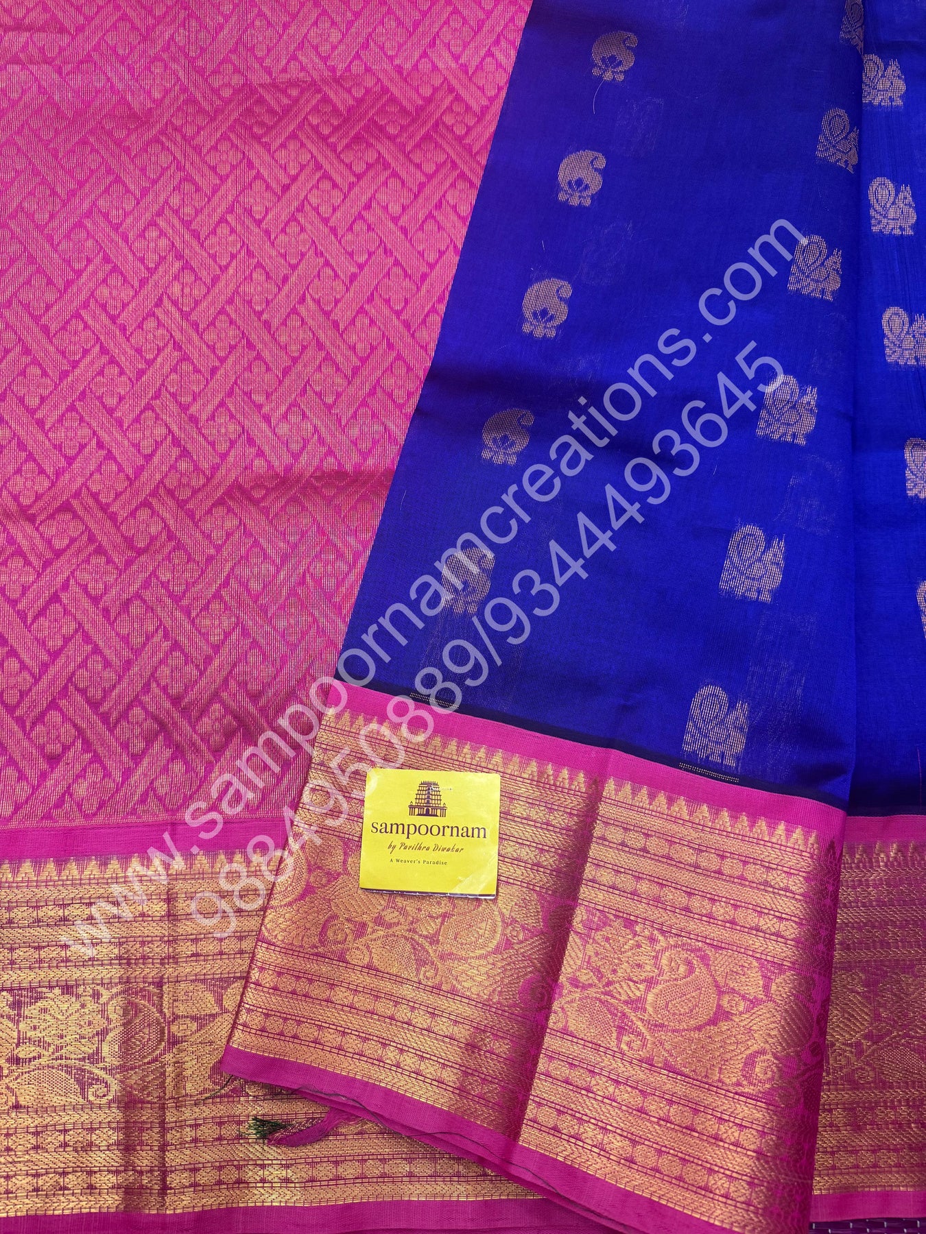 Royal Blue with Pink , rich Zari Mango and Annam Butta in the body , One side long traditional Borders and Grand Pallu Korvai Silk Cotton Saree