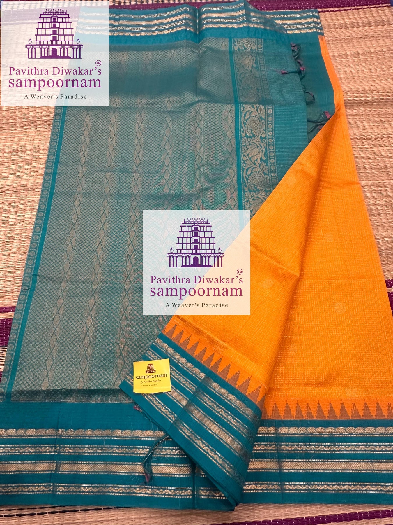 Mambazha Manjal with Turquoise Blue , rich zari Podi Kattam with butta in the body , temple traditional borders and rich Pallu Korvai Silk Cotton Sare