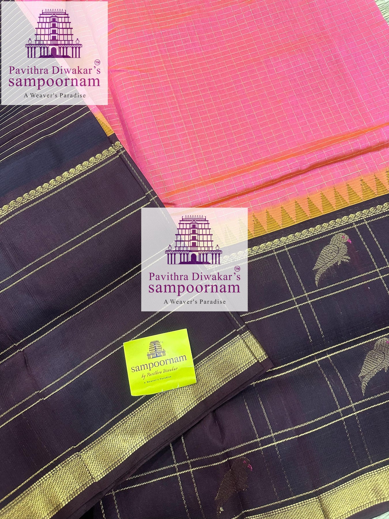 Peach Pink with Dark Brow ,one side big border with Kili motifs in Zari checks in the body and grand Pallu Korvai Silk Cotton Sare