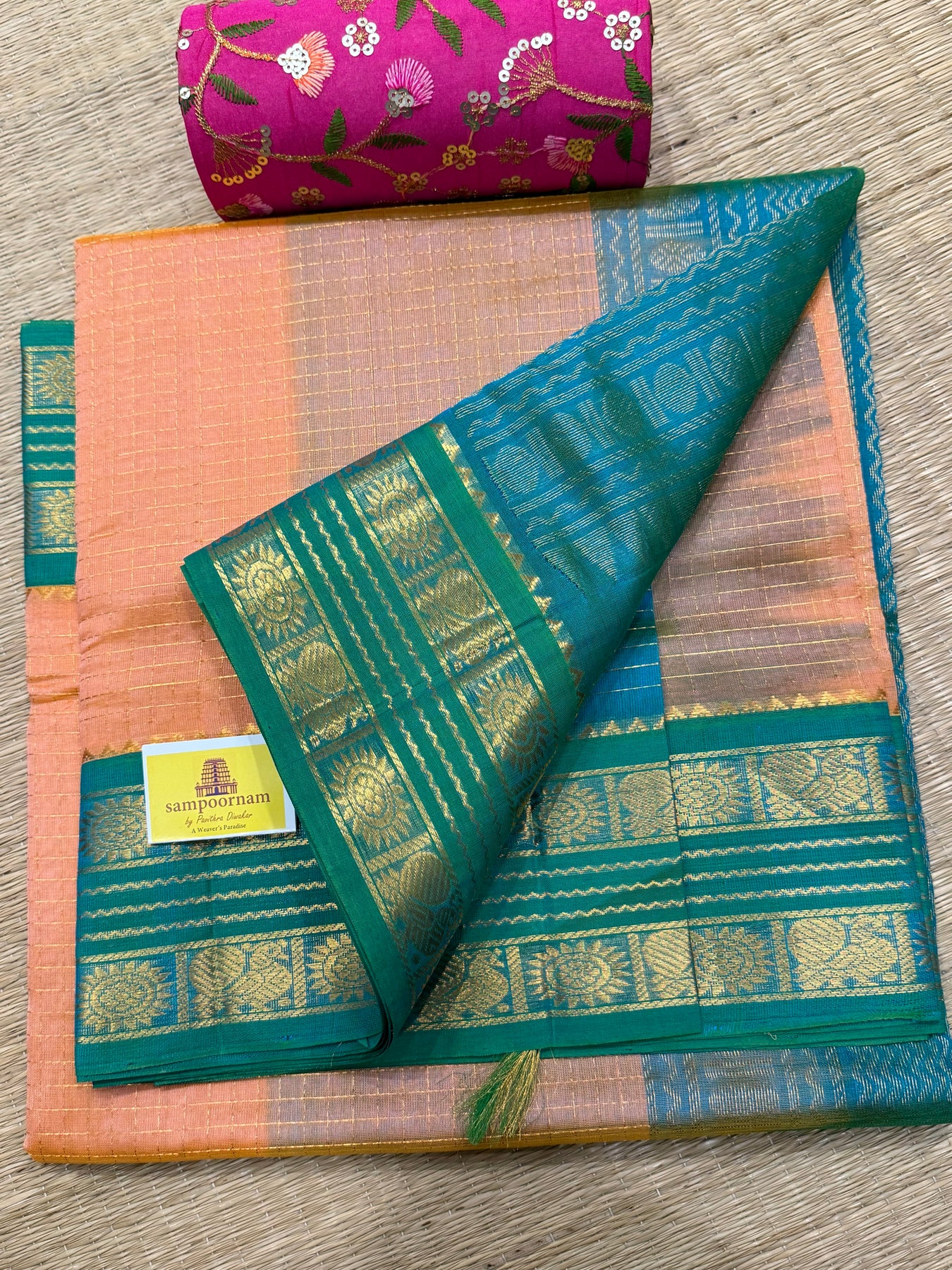 Peach Pink with Sea Green , rich Zari checks in the body ,rettapet border and grand Pallu Korvai Silk Cotton Saree