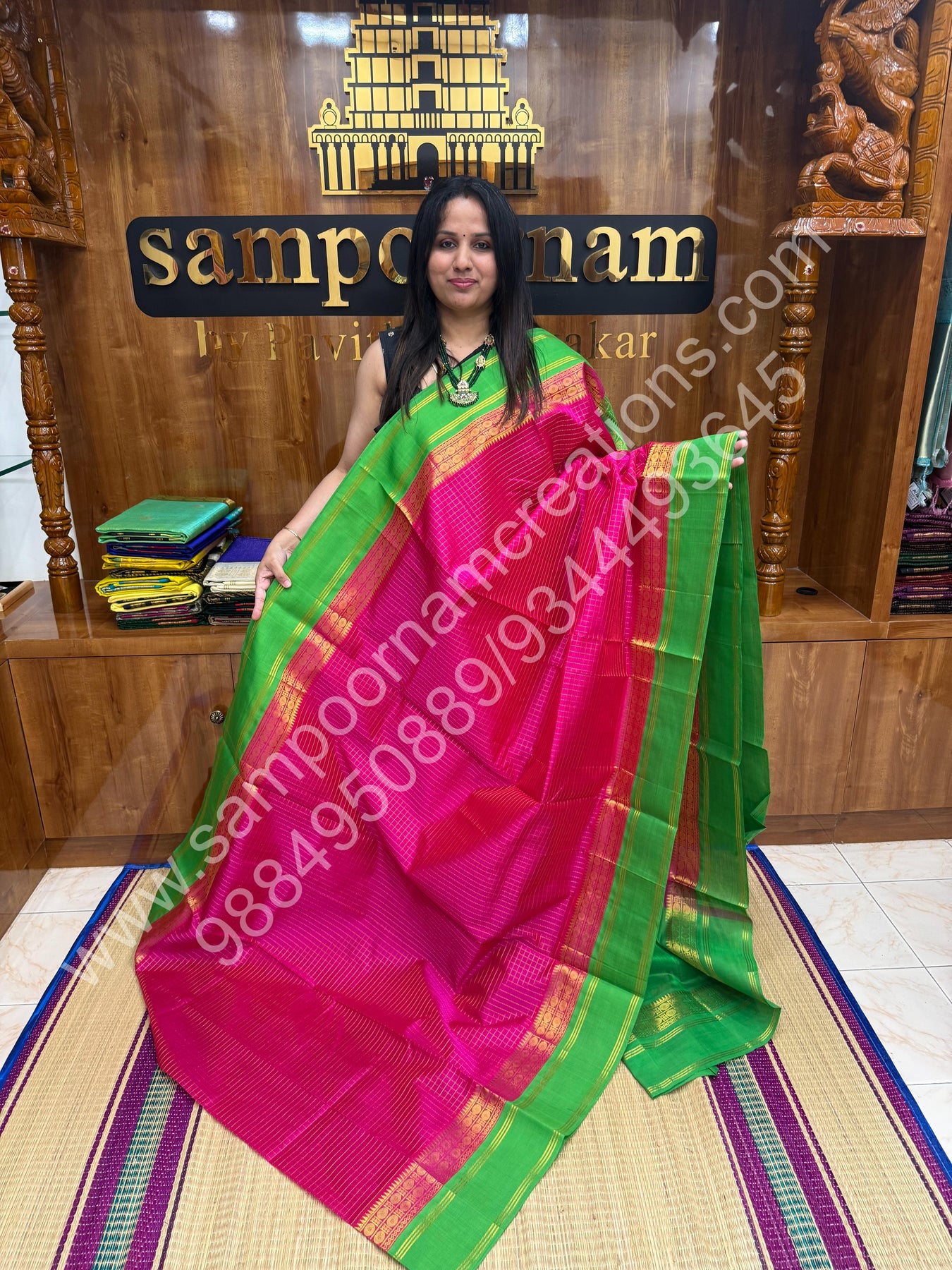 Rani Pink with Parrot Green , Zari checks in the body , rich borders with traditional Pallu Korvai Silk Cotton Saree