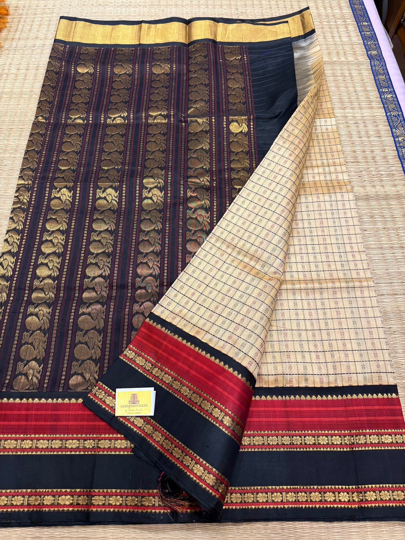 Cream with Black, Lakshadeepam thread butta in the body and silk border with rich Pallu Korvai Silk Cotton Saree