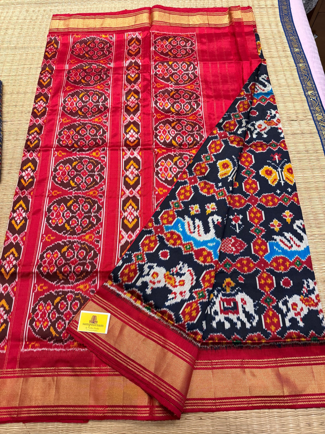 Blue with Red , Kanchi border and rich Pallu Pochampally Ikkat Silk Saree