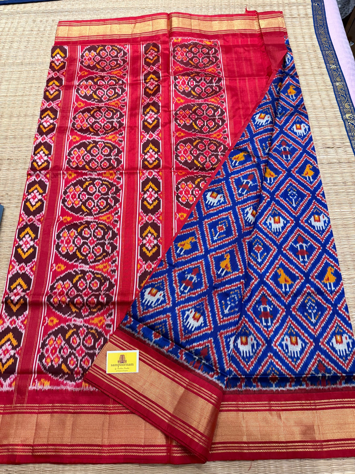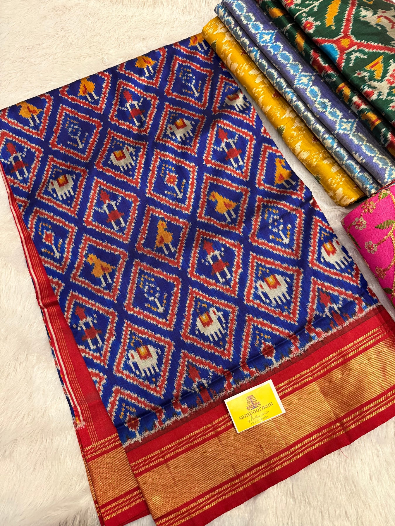 Blue with Red , traditional borders and rich Pallu Pochampally Ikkat Silk Saree