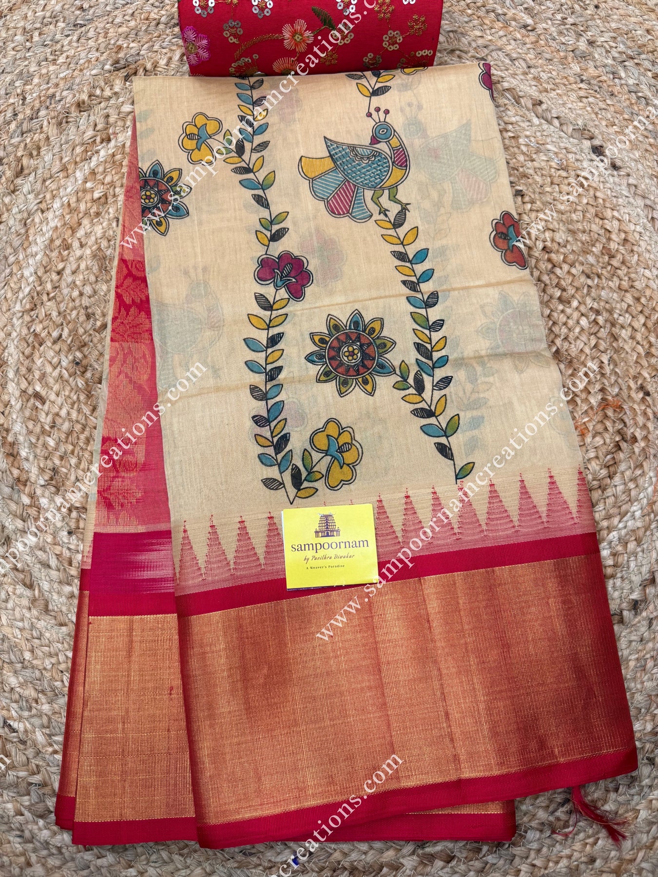Dark Beige with Red , Floral Madhubani Prints all over the body , Tissue borders with Temple design and rich Pallu Korvai Silk Cotton Saree