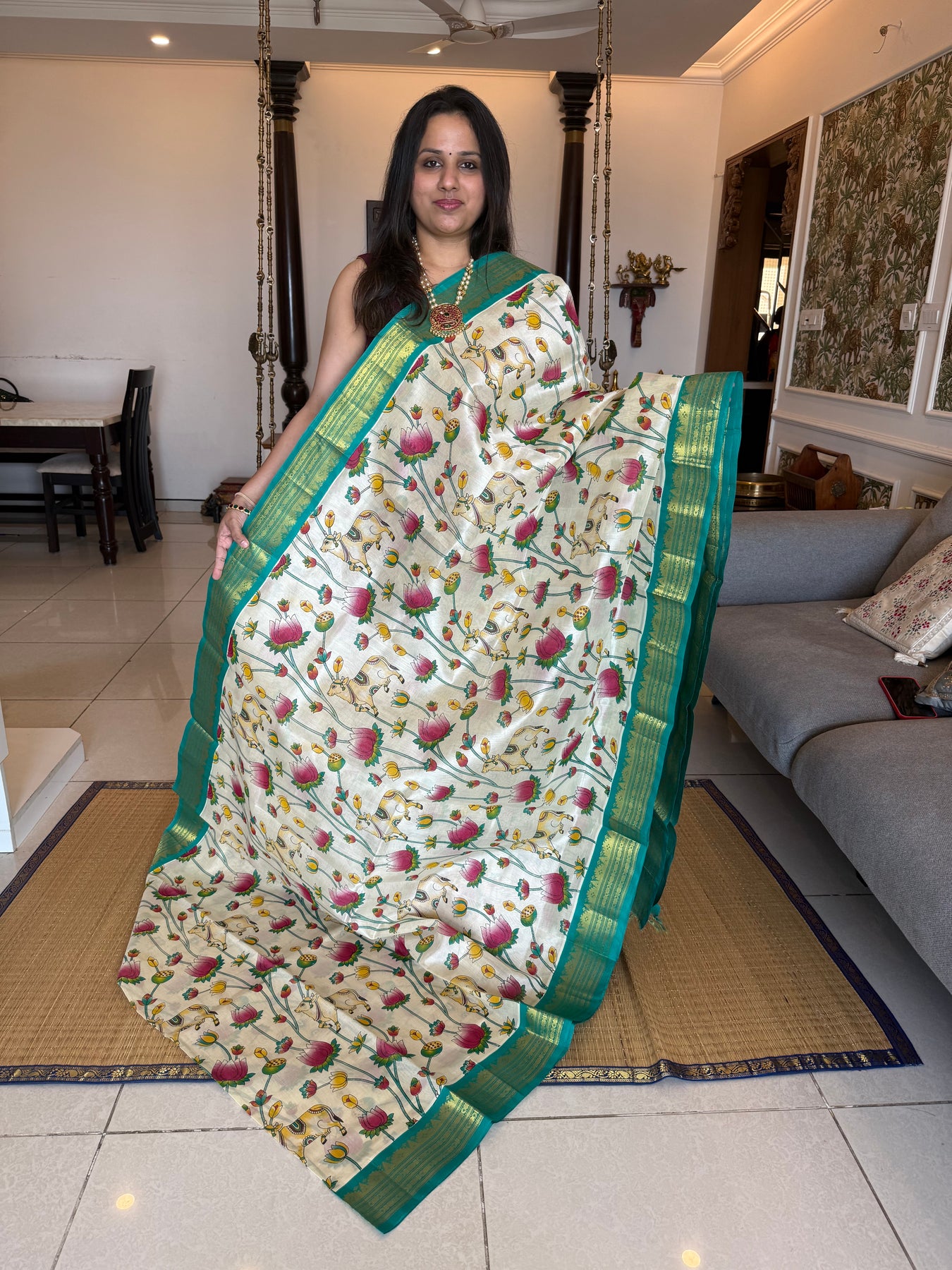 Offwhite with Turquoise traditional borders and rich Pallu , Pichwai printed Korvai Silk Cotton Saree