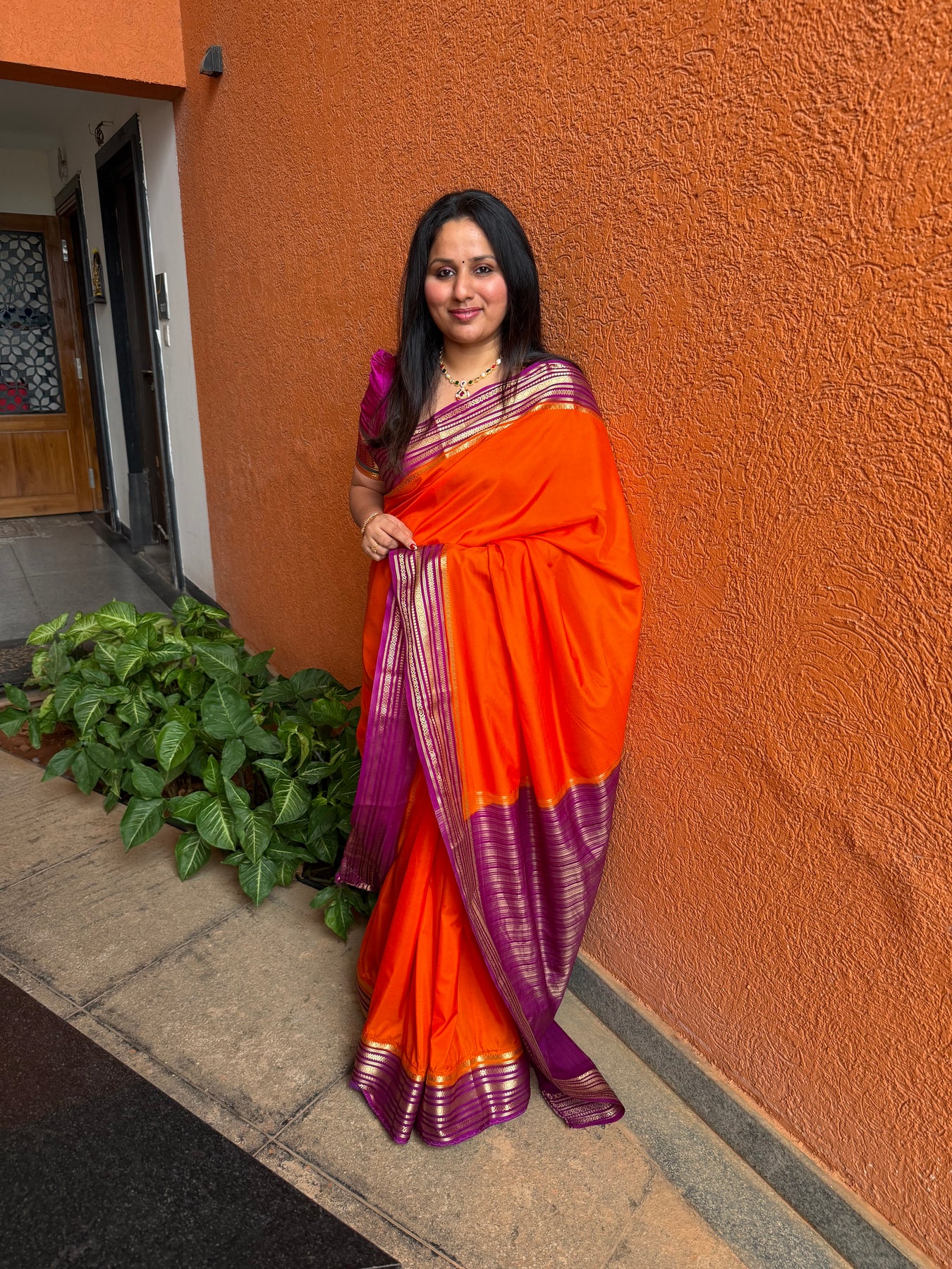 Burnt Orange with Purple , Rich Borders and Pallu, Semi Mysore Silk Saree