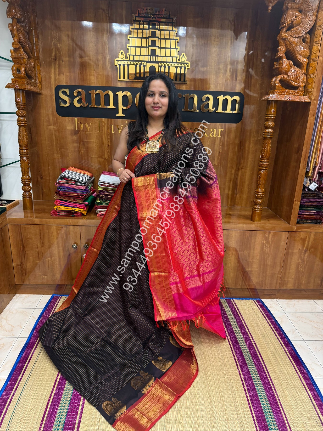 Dark Brown with Pink , Red Selvedge , Annam motif and Kanchi one side long border and Zari checks in the body , Rich Zari checks in the body , Grand Pallu Korvai Silk Cotton Saree