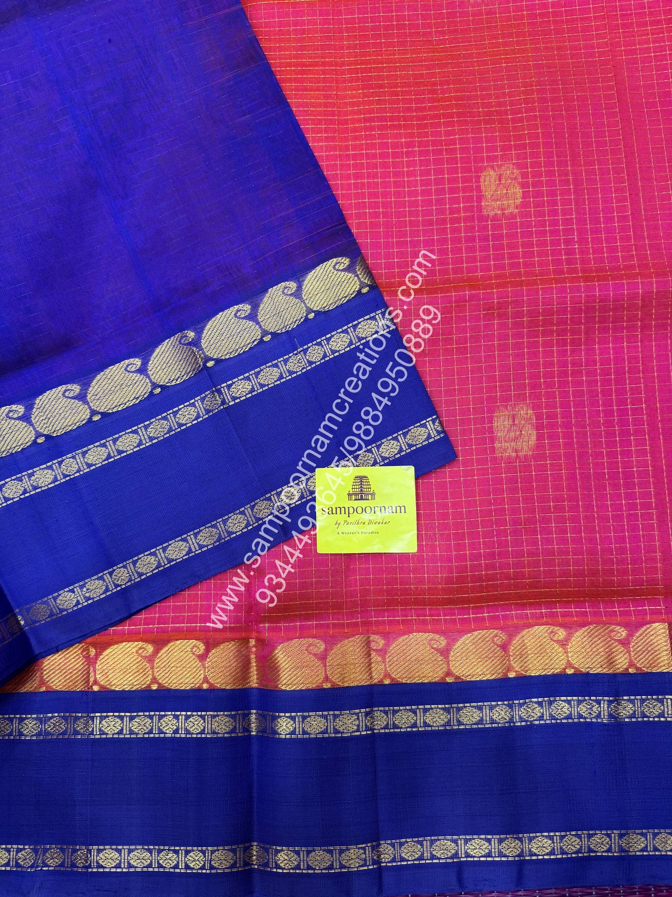 Peachish Pink with Blue , Rich Zari checks in the body , Mayil and Chakram rich butta in the body , Rettapet border and Grand Pallu Korvai Silk Cotton Saree