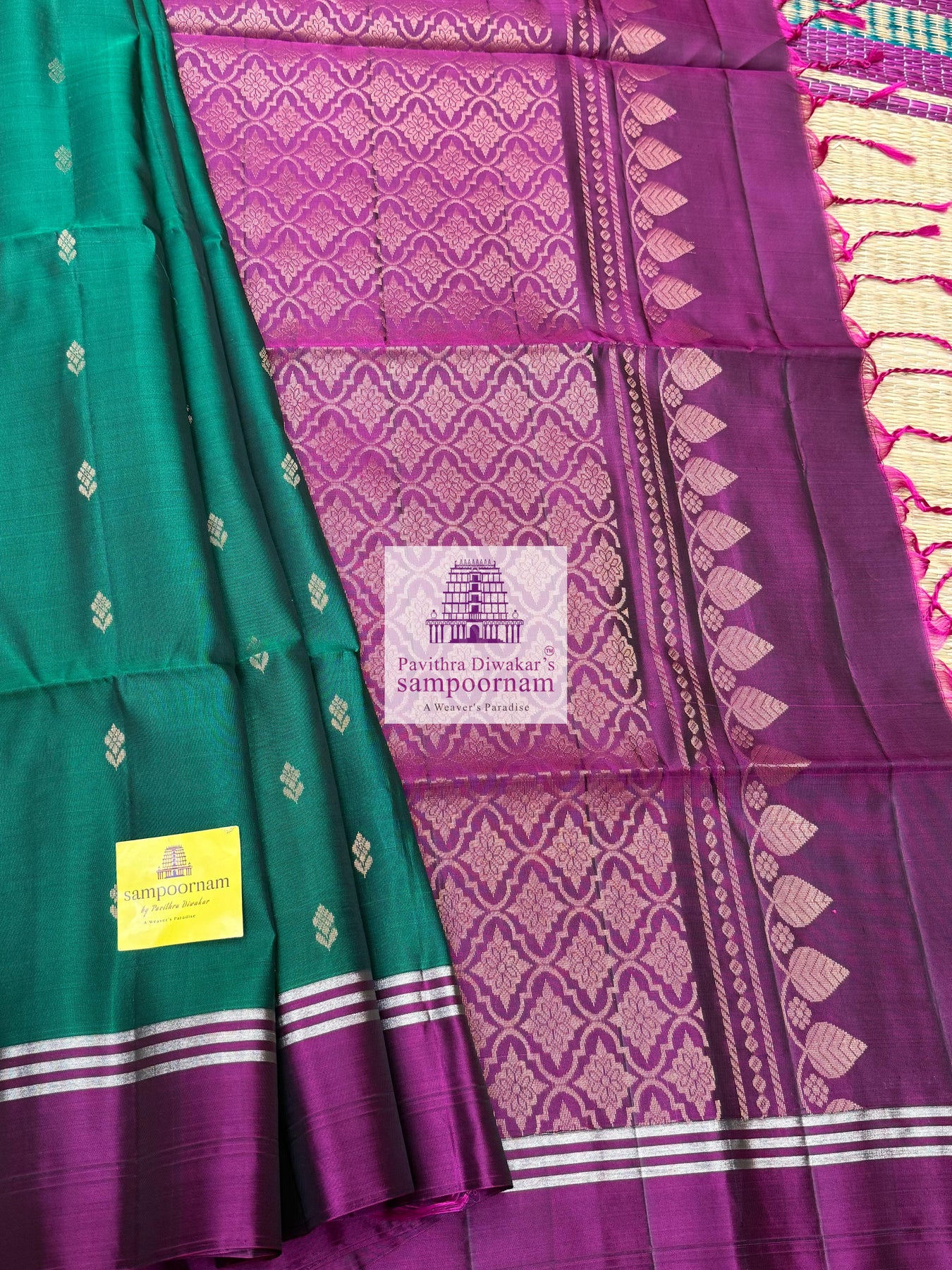 Forest Green with Magenta , rich Zari Butta in the body , Plain borders , rich Pallu Handloom Semi Soft Silk Saree