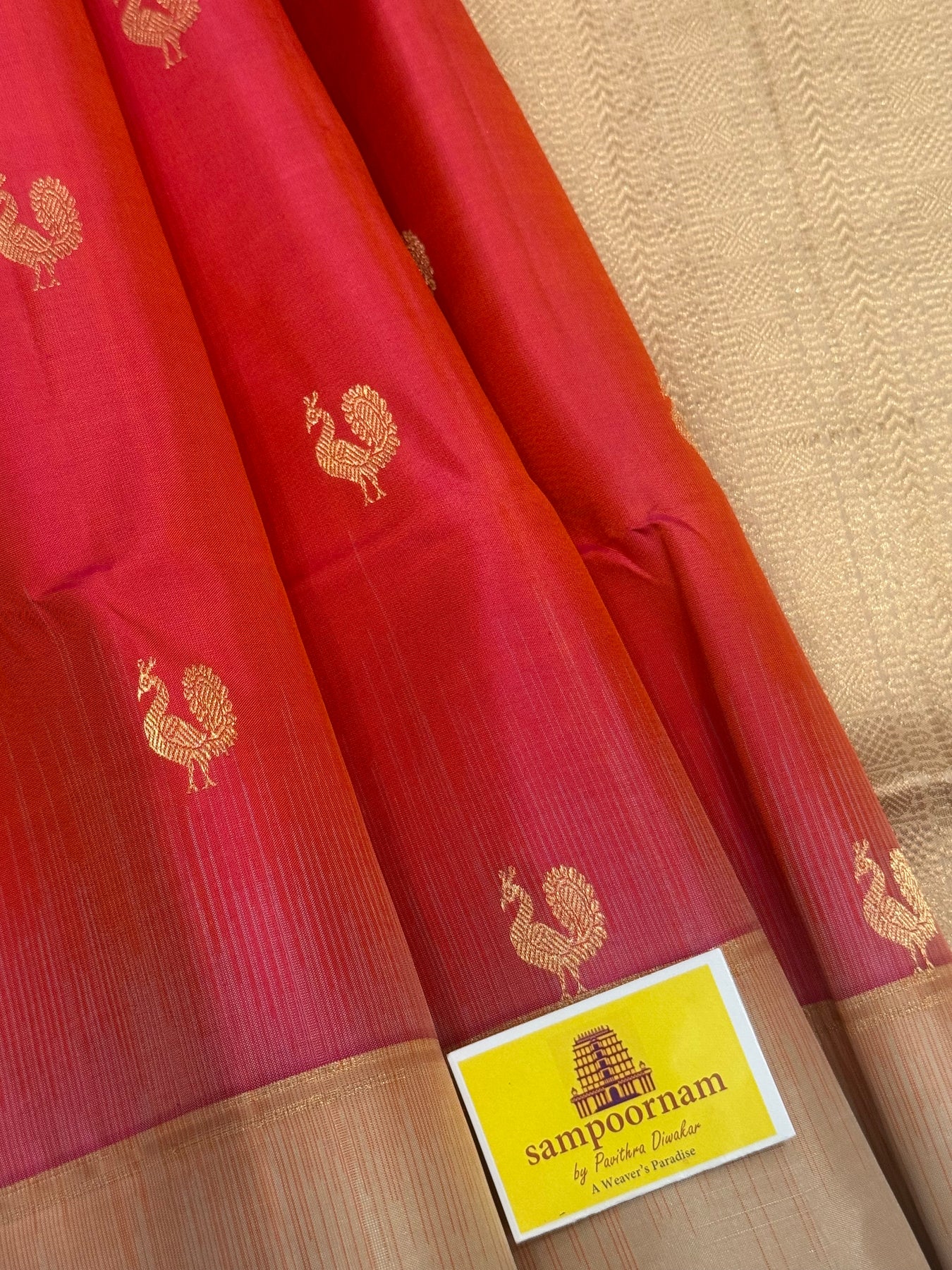Dark Pink with Beige , Zari Mayil butta in the body and grand  Pallu , pure soft silk saree