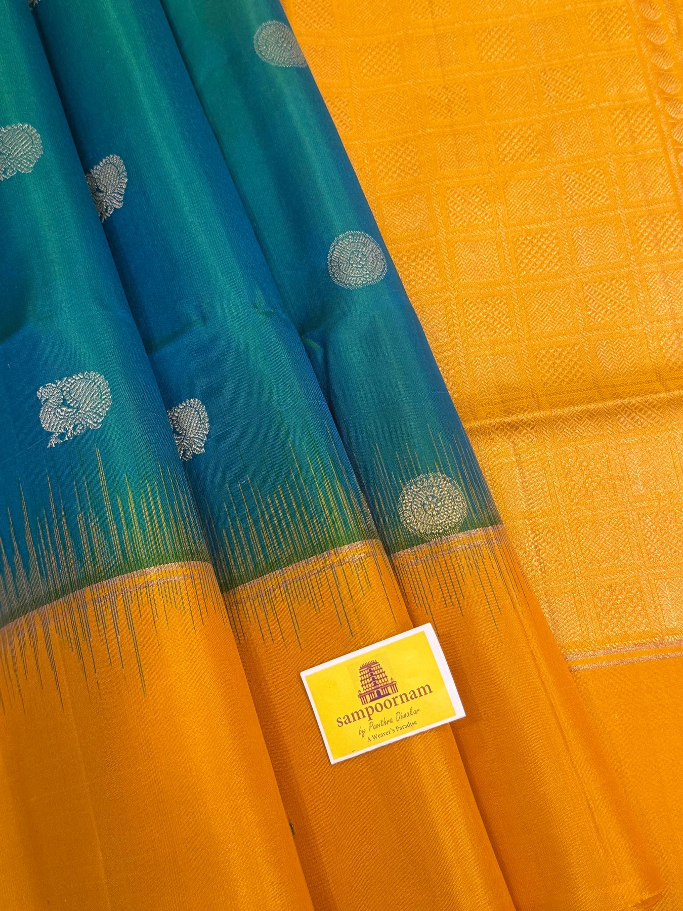 Greenish Blue with Manjal , rich zari rudraksh butta in the body , plain borders and rich Pallu , pure soft silk saree