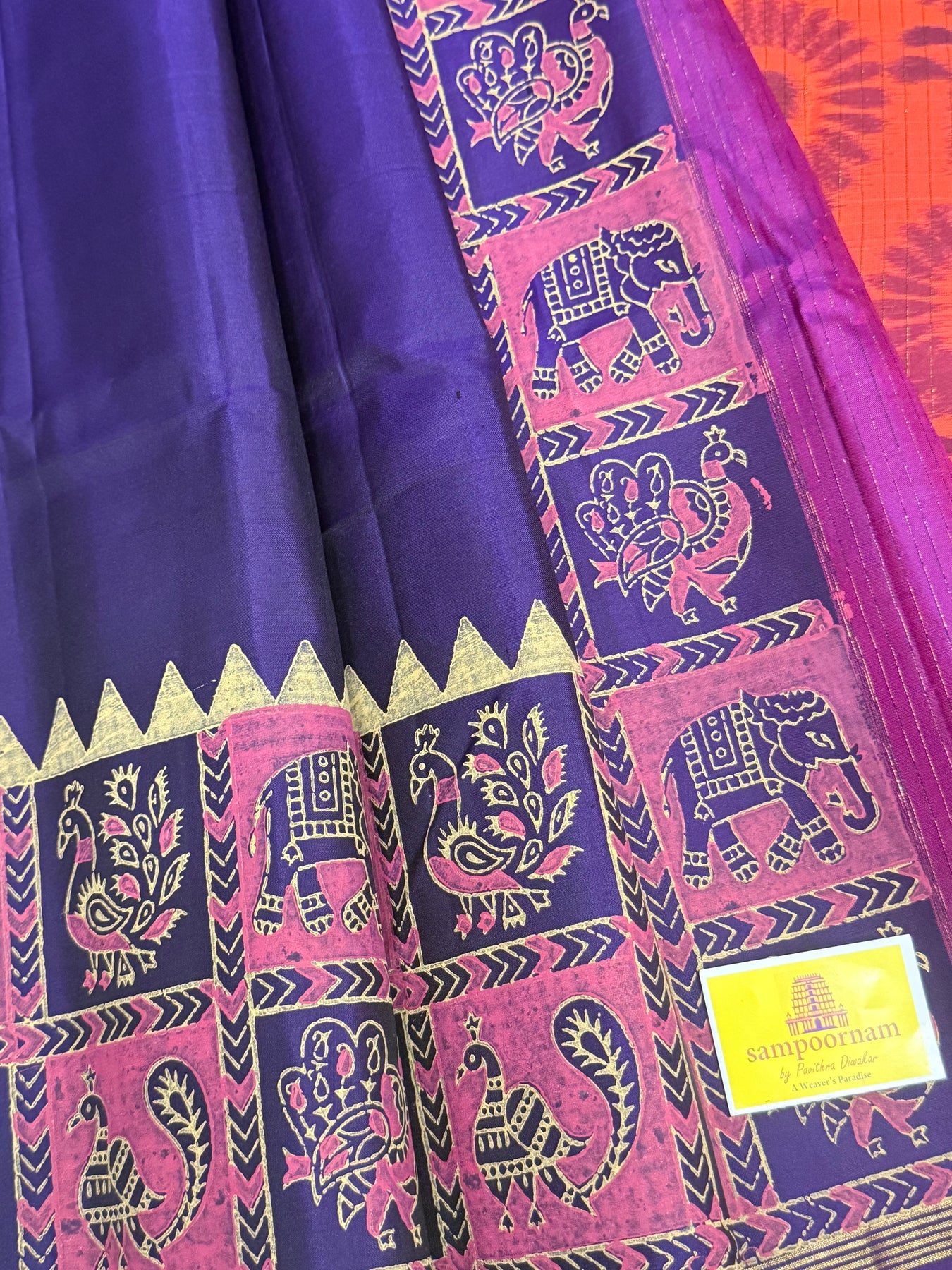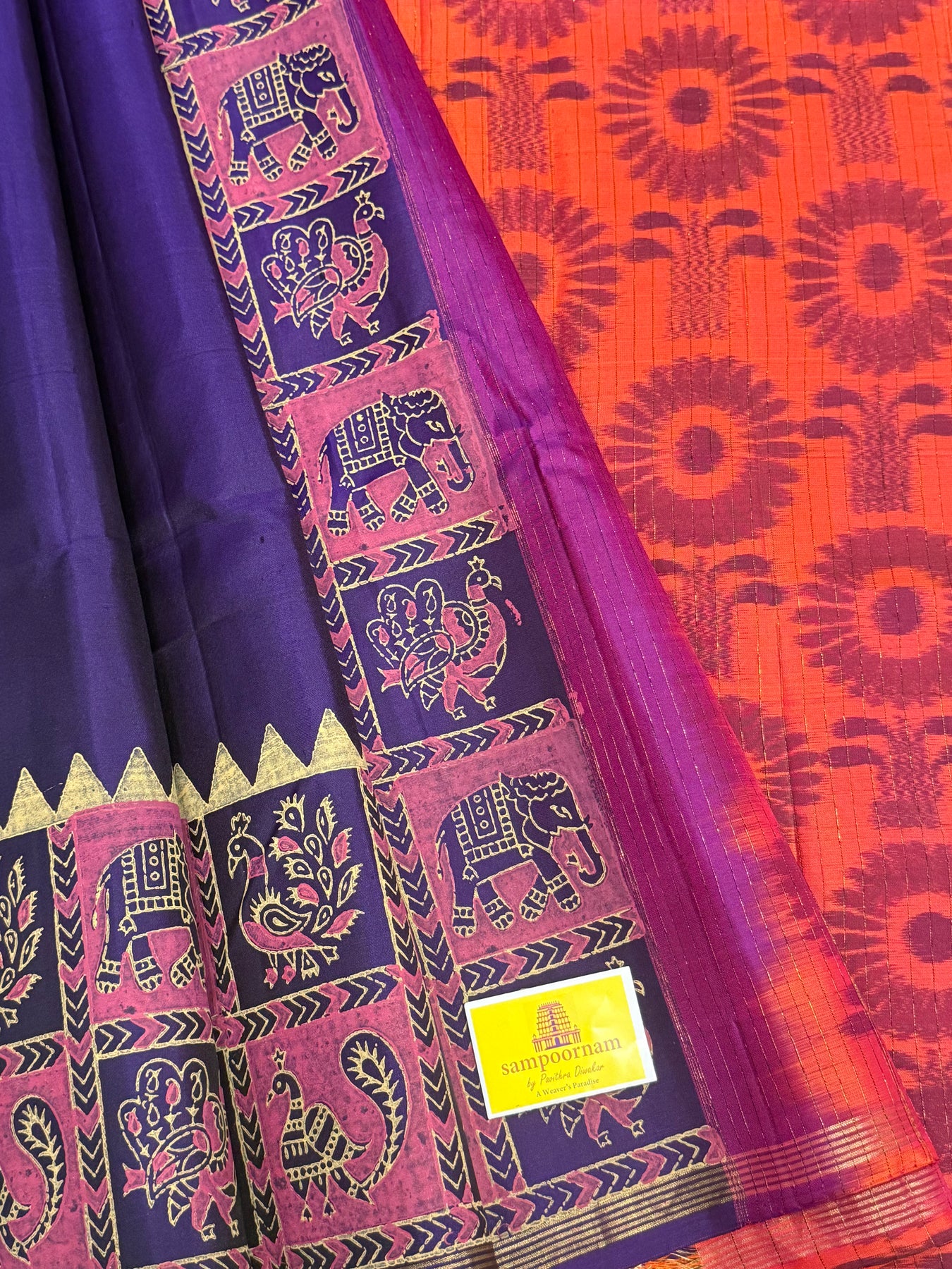 Indigo Blue with Reddish Orange , annam and elephant Handblock print in the borders , Pochampally Pallu and Blouse, pure soft silk saree