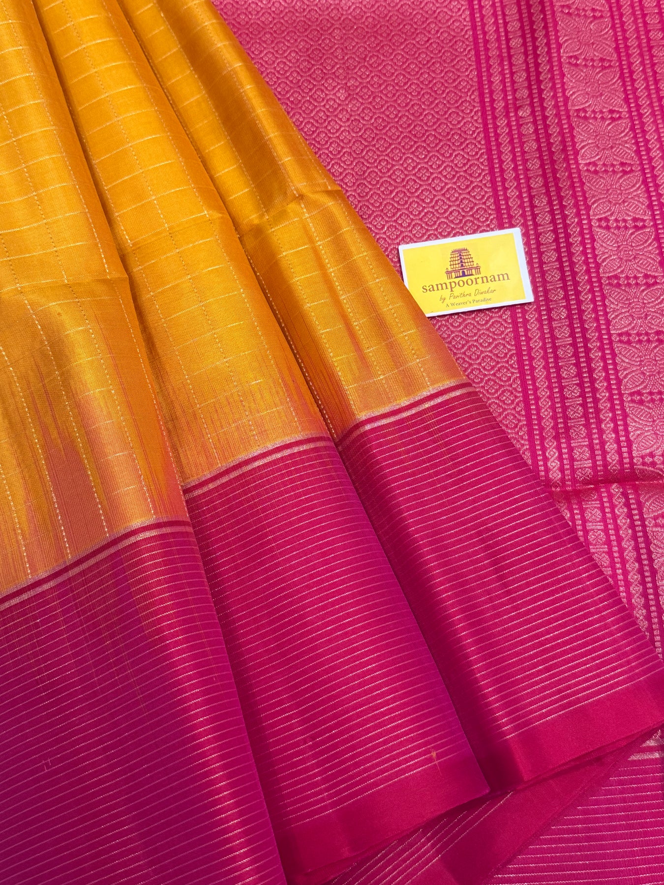 Manjal with Orangish Pink , rich zari annam and rudraksh butta in the body , plain borders and rich Pallu , pure soft silk saree