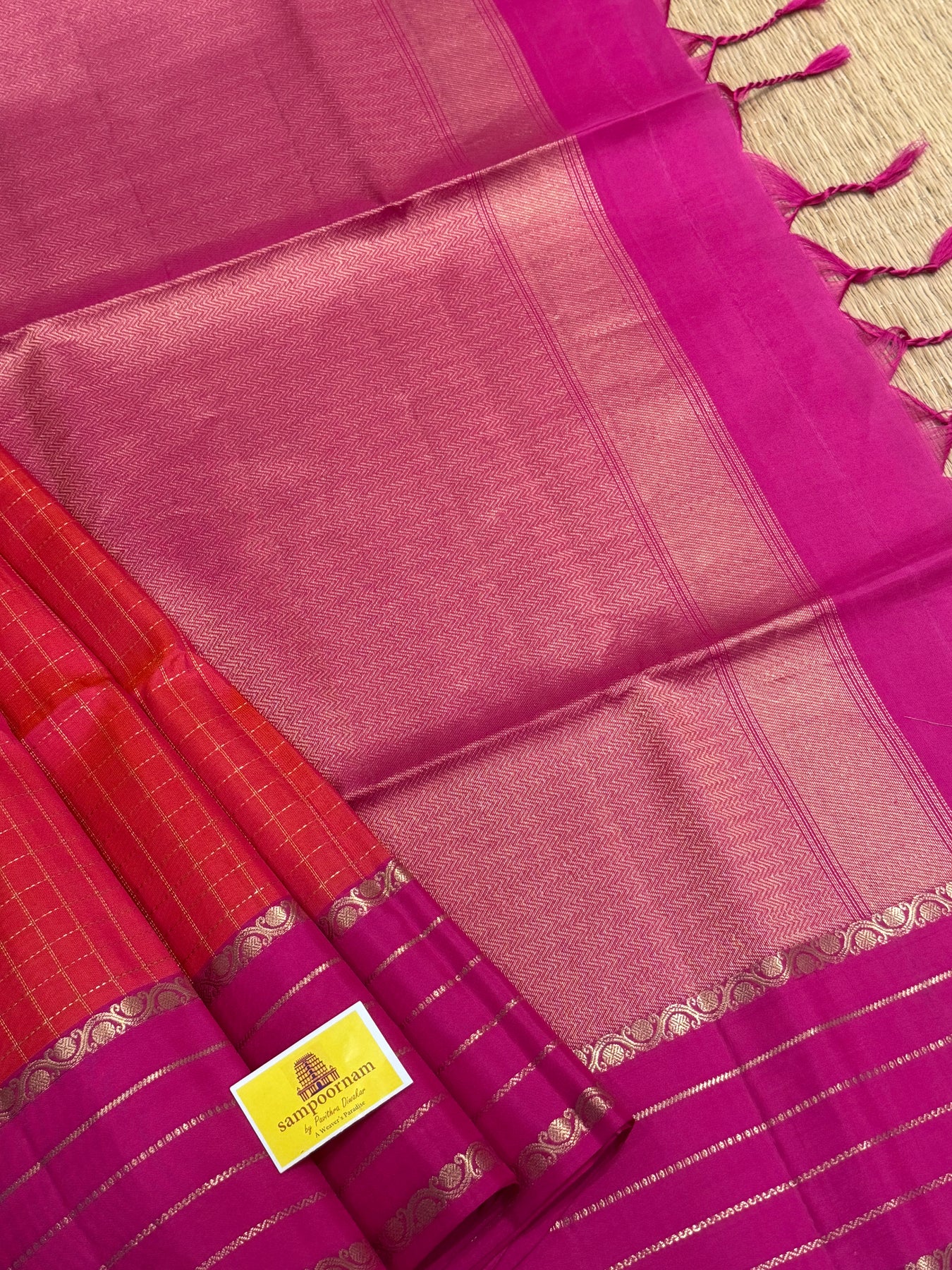 Reddish Pink with Rani Pink , rich Zari checks in the body , rettapet Veldari Zari lines in the border and rich Pallu , pure soft silk saree