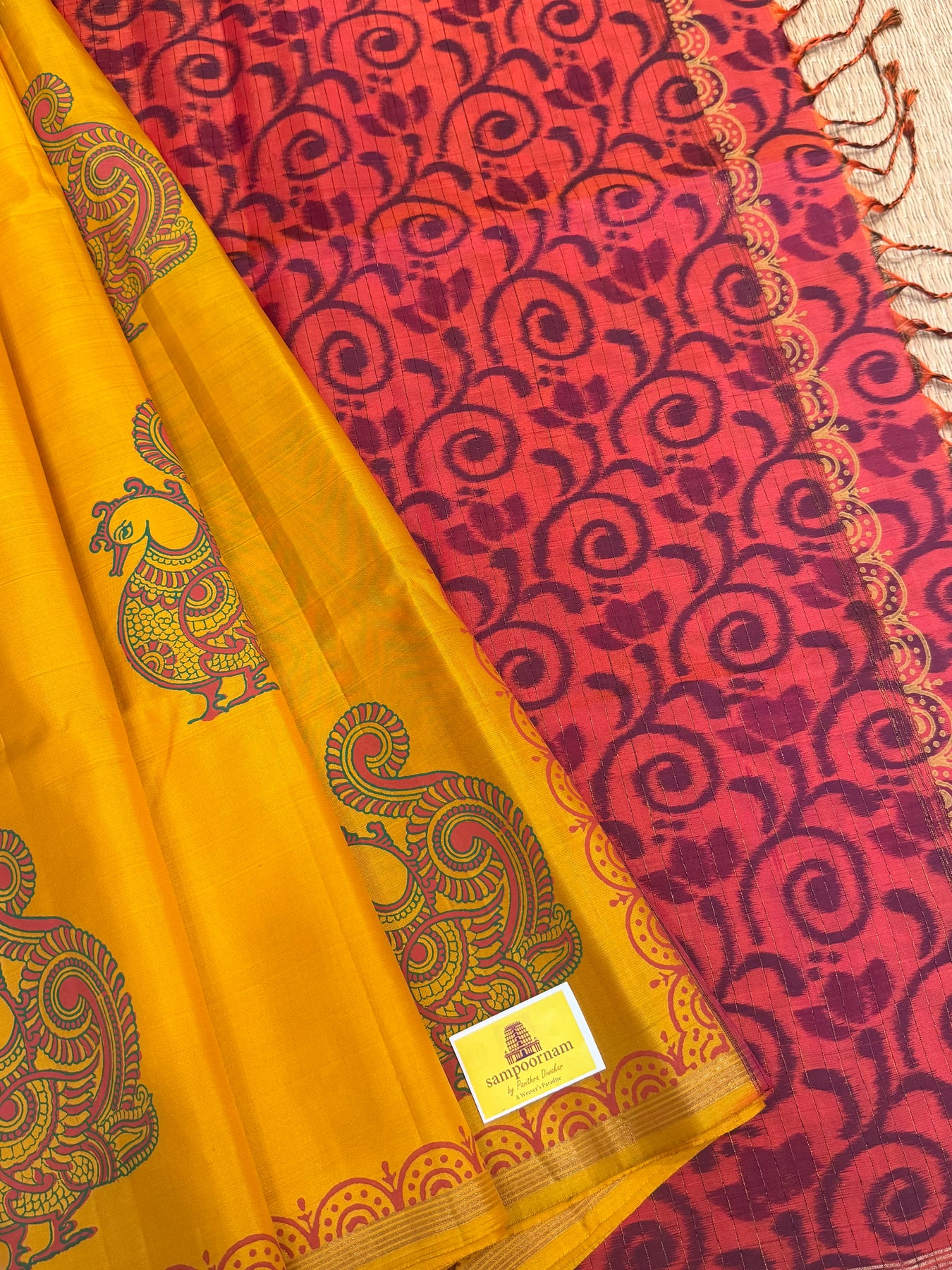 Yellow with Reddish Orange , annam Handblock print in the body , Pochampalli Pallu and Blouse  , pure soft silk saree