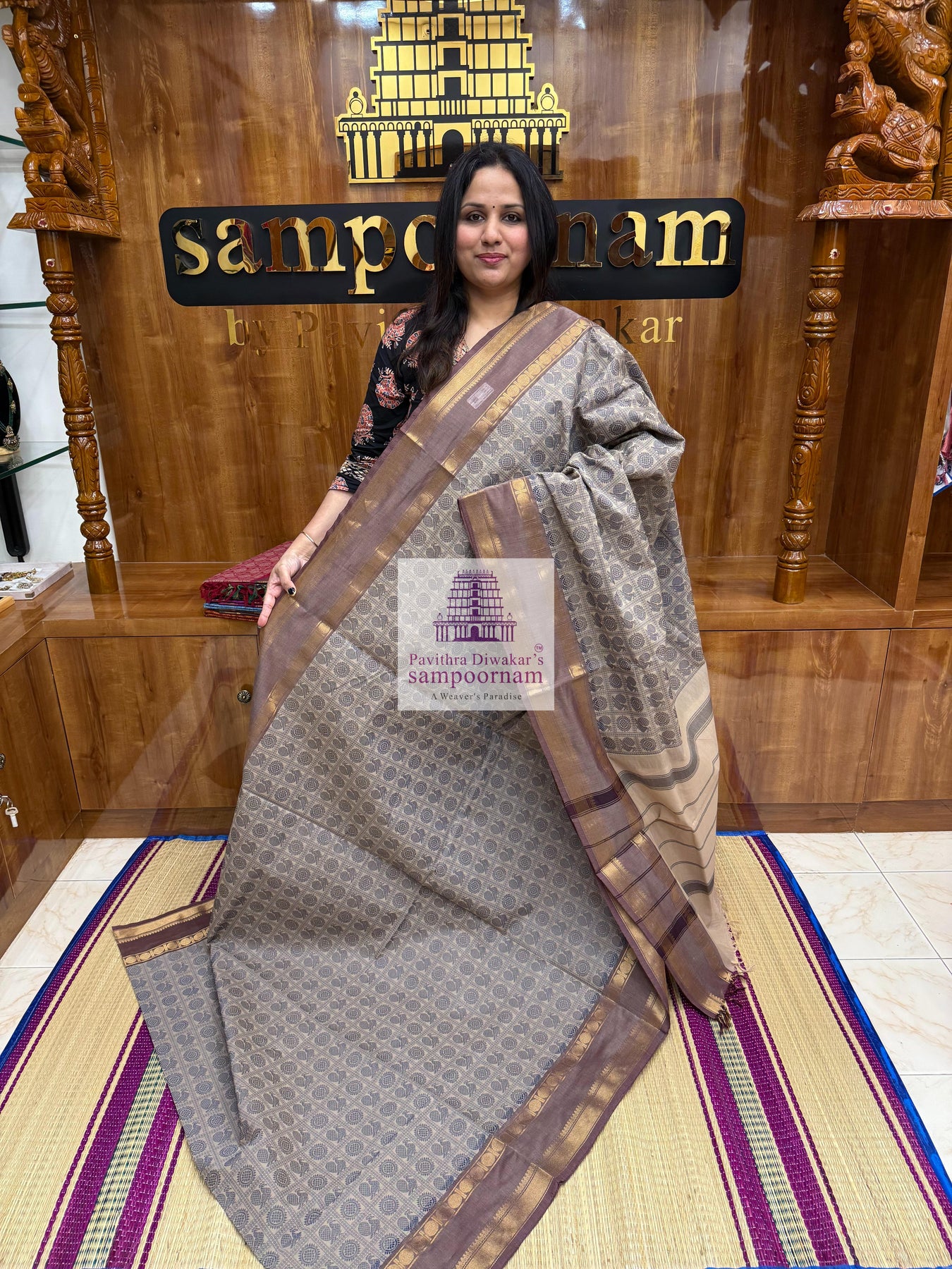 Cream with Grey , Annam and Chakram thread butta in the body , rettapet border and plain Pallu Chettinad Cotton Saree
