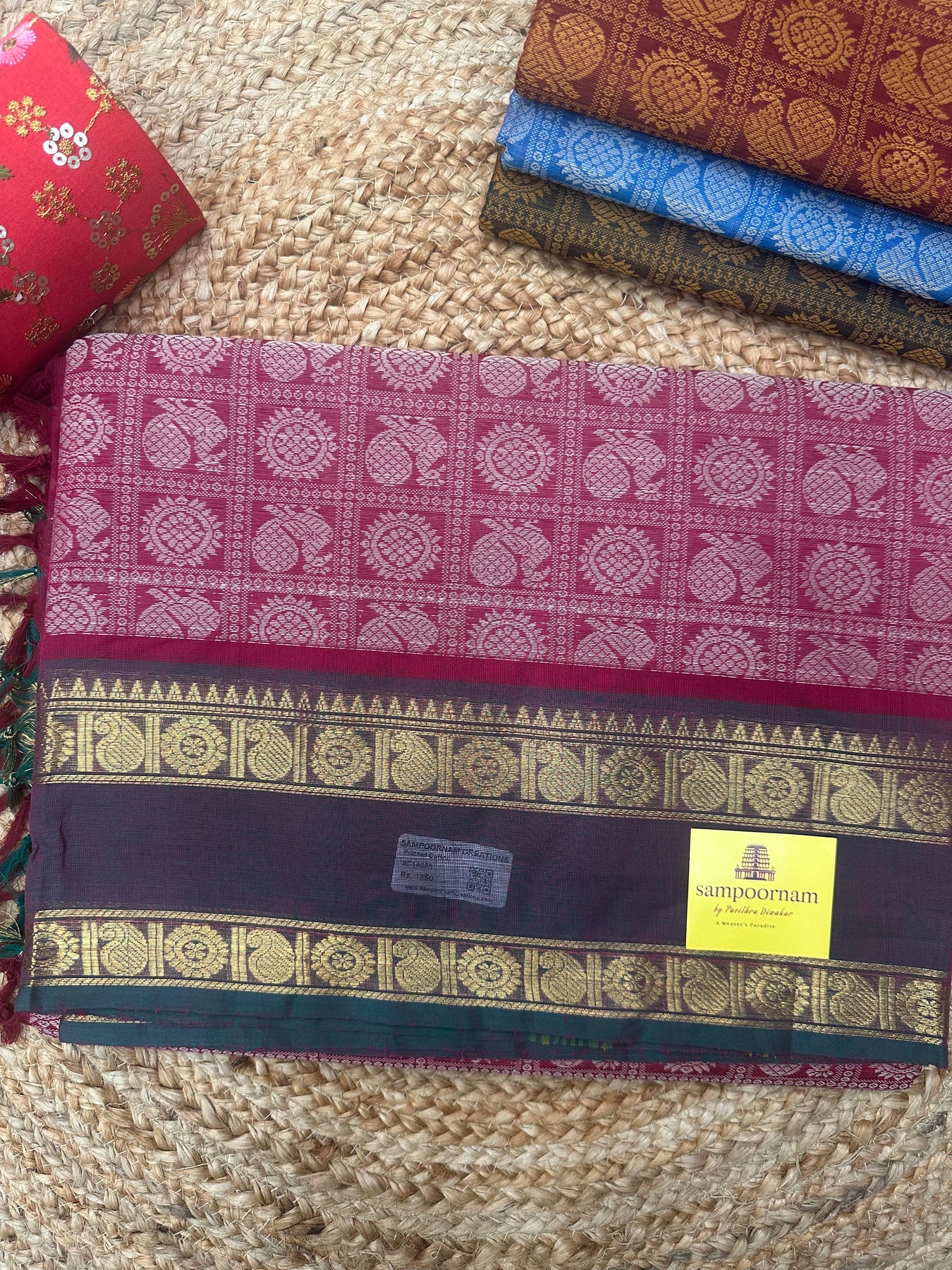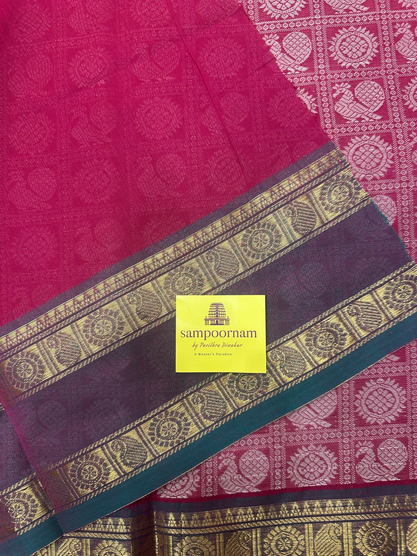 Red with Manthulir Green , Annam and Chakram thread butta in the body , rettapet border and simple Plain Chettinad Cotton Saree
