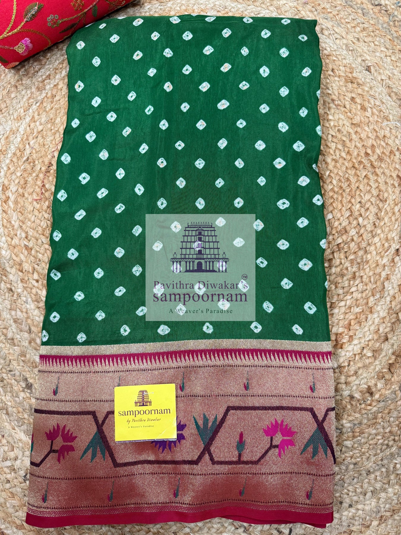 Green with Red , Bandhini prints in the body , with Paithani rich Zari borders and Pallu , plain Red blouse , Pure Vegan Silk Saree